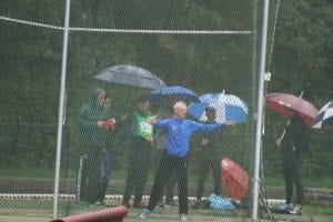Daarna om 12.00 het hoogspringen. Ondanks verwoede pogingen om de afzet te ontdoen van plassen en een extra ploegleidersvergadering, besloot de wedstrijdleider toch maar om het hoogspringen te schrappen. Jammer van de punten, maar toch niet al te treurig; het zag er niet erg aanlokkelijk uit. Atletiek met mooi weer is toch leuker!