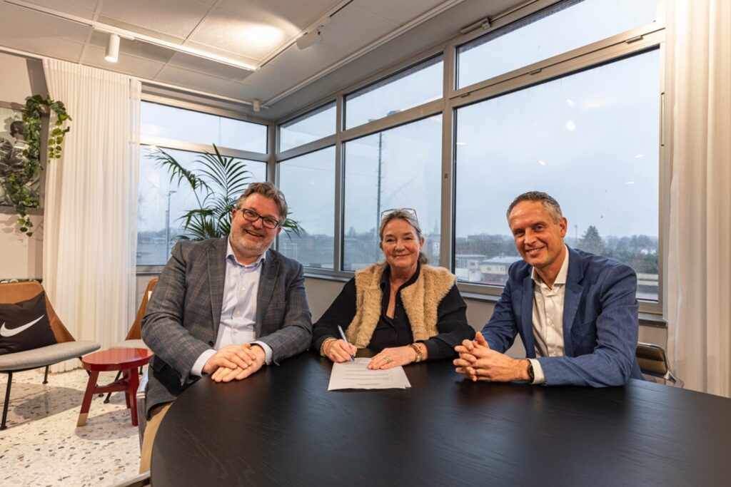 Peter van der Schoot (l), Joyce Schaap (Nike EMEA) en Bart van den Haak tijdens het tekenmoment