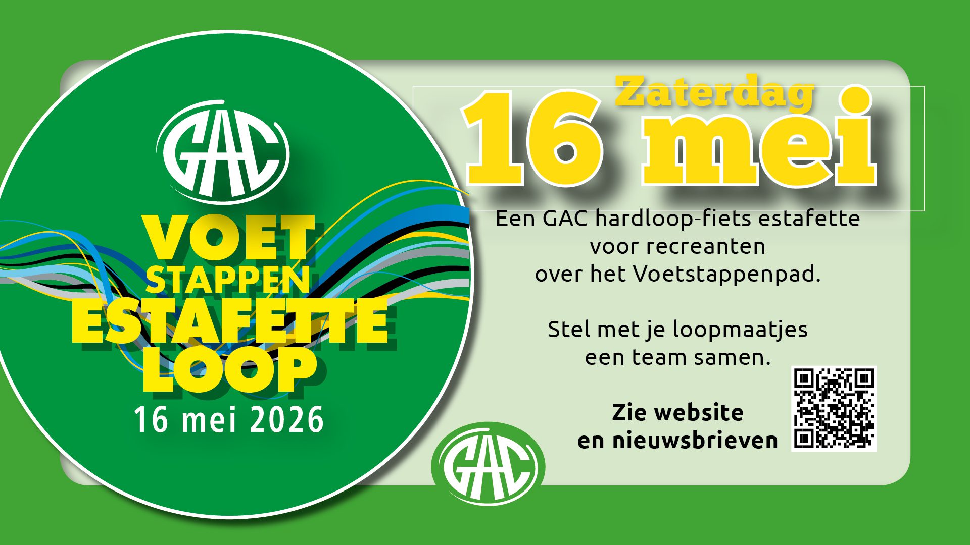 Yes, zaterdag 16 mei is het weer zover: de jaarlijkse Voetstappenpad Estafette. De enige loop bij GAC die lopend èn per fiets kan worden afgelegd De route is namelijk opgedeeld in 11 delen met wisselplekken (lengte variërend van 1,5 tot max. 3 km). En per wisselplek kan er gewisseld worden van lopers en fietsers.Fietsers volgen op een aantal stukken van het parcours een iets andere route dan de lopers.